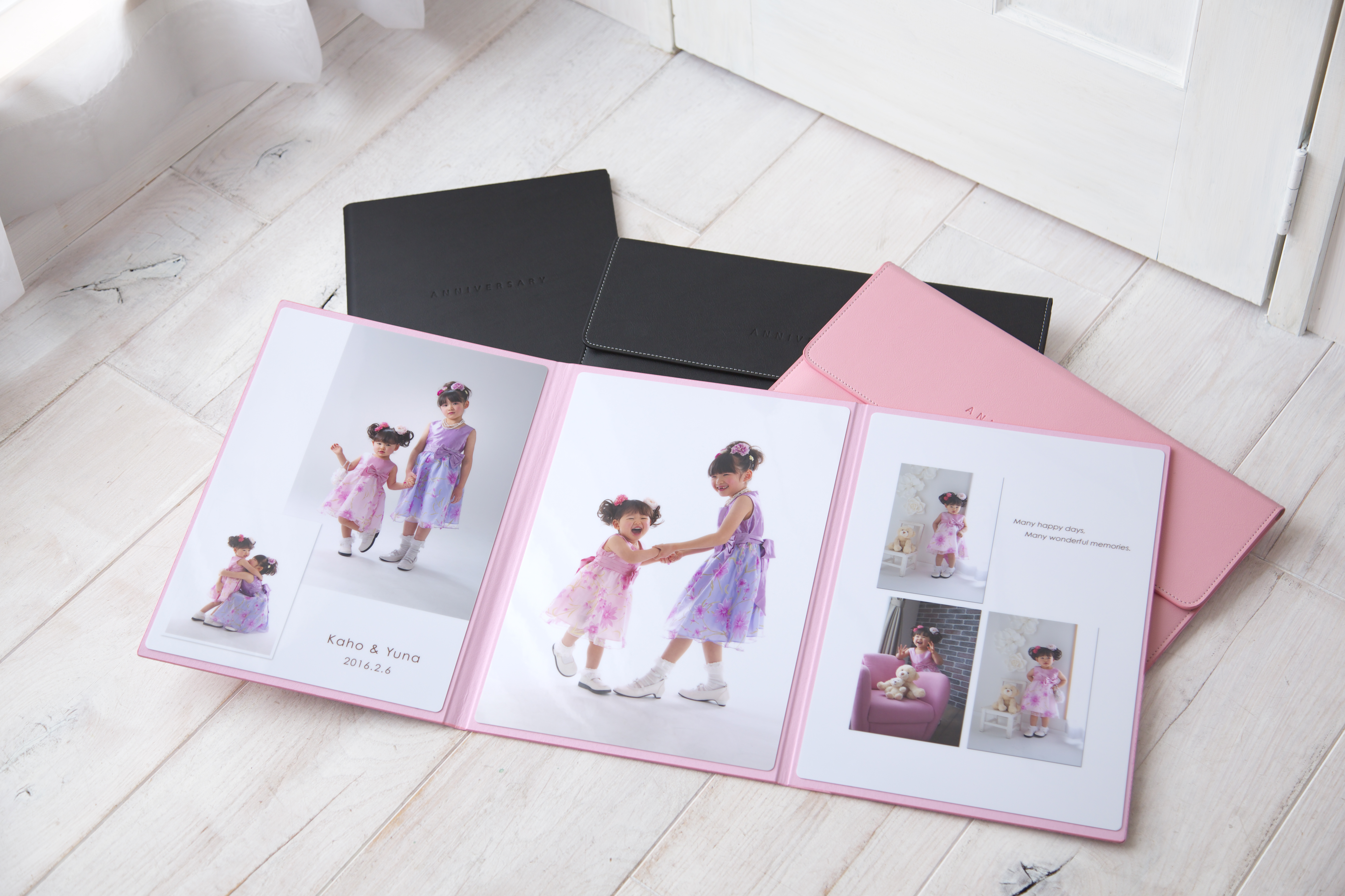 ベーシックな台紙の仕上げでは少し小さめの八切りサイズの写真を入れる事ができて、表紙はお好みの色を選んでいただく事ができるものが人気です。表紙の素材は厚みがあって手触りが良く、色もそれぞれとっても可愛いのでこちらもお部屋の棚に飾っていただく事をお勧めしています。